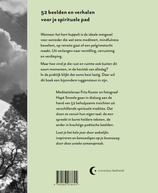 Wanneer het hart huppelt is de ideale metgezel voor eenieder die wel eens mediteert, mindfulness beoefent, op retraite gaat of een pelgrimstocht maakt. Uit verlangen naar verstilling, verruiming en verdieping. Maar hoe vind je die rust en ruimte ook buiten dit soort momenten, in de hectiek van alledag? In de praktijk blijkt dat soms best lastig. Daar wil dit boek een bijzondere ruggensteun in zijn. Meditatieleraar Frits Koster en fotograaf Hapé Smeele gaan in dialoog aan de hand van 52 behulpzame inzichten uit verschillende spirituele tradities. Dat doen ze vanuit hun eigen taal: de een spreekt in korte heldere teksten, de ander in krachtige poëtische beelden.