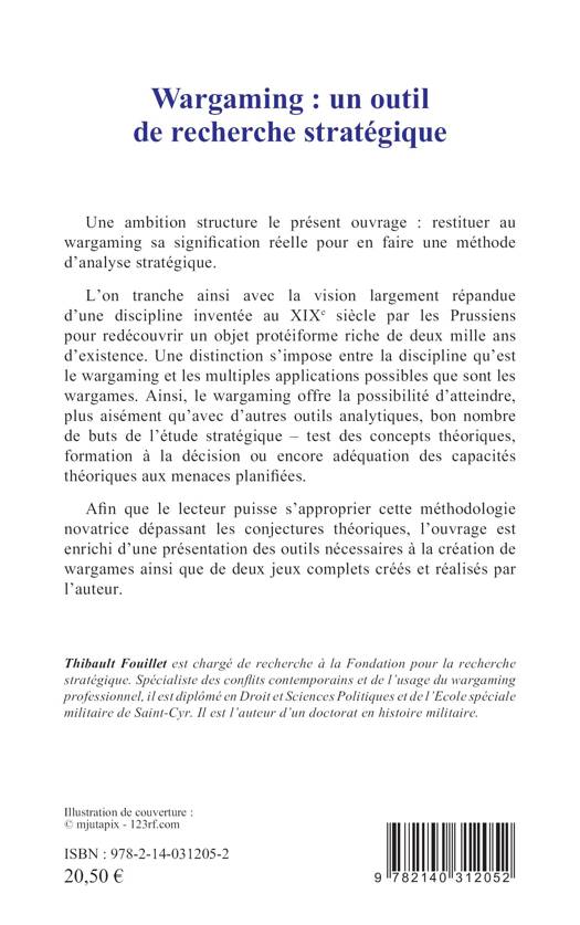 Une ambition structure le présent ouvrage : restituer au wargaming sa signification réelle pour en faire une méthode d'analyse stratégique. L'on tranche ainsi avec la vision largement répandue d'une discipline inventée au XIXe siècle par les Prussiens pour redécouvrir un objet protéiforme riche de deux mille ans d'existence. Une distinction s'impose entre la discipline qu'est le wargaming et les multiples applications possibles que sont les wargames. Ainsi, le wargaming offre la possibilité d'atteindre, plus aisément qu'avec d'autres outils analytiques, bon nombre de buts de l'étude stratégique test des concepts théoriques, formation à la décision ou encore adéquation des capacités théoriques aux menaces planifiées. Afin que le lecteur puisse s'approprier cette méthodologie novatrice dépassant les conjectures théoriques, l'ouvrage est enrichi d'une présentation des outils nécessaires à la création de wargames ainsi que de deux jeux complets créés et réalisés par l'auteur.