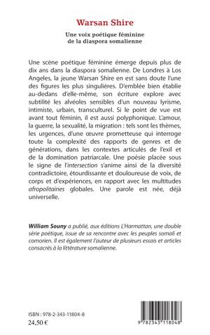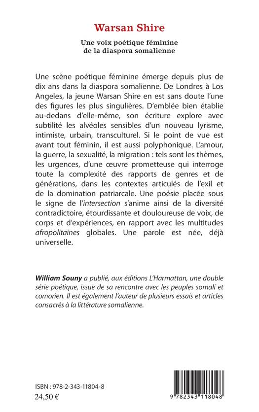 Une scène poétique féminine émerge dans la diaspora somalienne dont la jeune Warsan Shire est l'une des figures les plus singulières. Son écriture explore avec subtilité les alvéoles sensibles d'un nouveau lyrisme, intimiste, urbain, transculturel. Si le point de vue est avant tout féminin, il est aussi polyphonique. L'amour, la guerre, la sexualité, la migration : ces thèmes interrogent la complexité des rapports de genres et de générations, dans les contextes de l'exil et de la domination patriarcale.