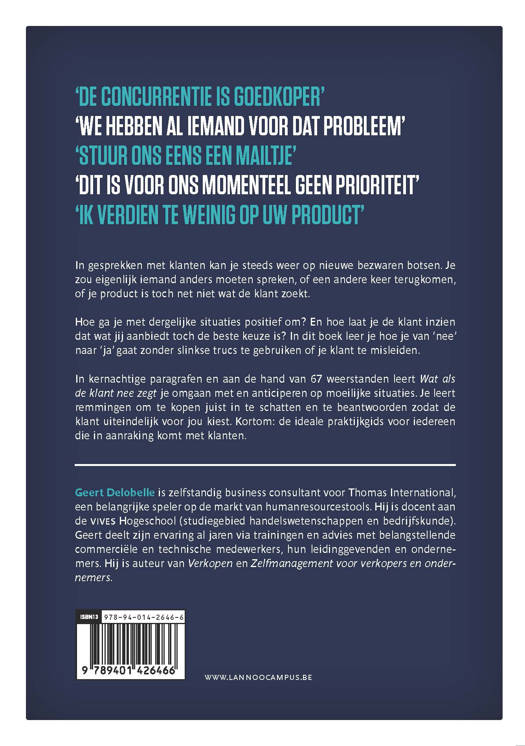 Een antwoord op alle vragen die verkopers zich stellen 'DE CONCURRENTIE IS GOEDKOPER' 'WE HEBBEN AL IEMAND VOOR DAT PROBLEEM' 'STUUR ONS EENS EEN MAILTJE' 'DIT IS VOOR ONS MOMENTEEL GEEN PRIORITEIT' 'IK VERDIEN TE WEINIG OP UW PRODUCT' In gesprekken met klanten kan je steeds weer op nieuwe bezwaren botsen. Je zou eigenlijk iemand anders moeten spreken, of een andere keer terugkomen, of je product is toch net niet wat de klant zoekt. Hoe ga je met dergelijke situaties positief om? En hoe laat je de klant inzien dat wat jij aanbiedt toch de beste keuze is? In dit boek leer je hoe je van 'nee' naar 'ja' gaat zonder slinkse trucs te gebruiken of je klant te misleiden. In kernachtige paragrafen en aan de hand van 67 weerstanden leert Wat als de klant nee zegt je omgaan met en anticiperen op moeilijke situaties. Je leert remmingen om te kopen juist in te schatten en te beantwoorden zodat de klant uiteindelijk voor jou kiest. Kortom: de ideale praktijkgids voor iedereen die in aanraking komt met klanten.