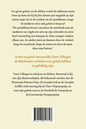 De olifant voelt zich heel gelukkig worden omdat de eekhoorn niet boos wordt als hij hem bij het dansen steeds per ongeluk op de tenen trapt. De schildpad twijfelt en denkt het ene moment dat hij heel gelukkig is en het andere moment diep ongelukkig. Ondertussen vraagt de meikever in de winkel van de sprinkhaan verlegen of hij ook geluk verkoopt?