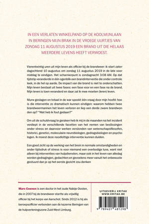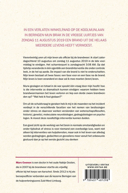 In een verlaten winkelpand op de Koolmijnlaan in Beringen-Mijn brak in de vroege uurtjes van zondag 11 augustus 2019 een brand uit die helaas meerdere levens heeft verwoest. Vierentwintig uren uit mijn leven als officier bij de brandweer: ik start zaterdagochtend 10 augustus om zondag 11 augustus 2019 in de late voormiddag te eindigen. Het scharnierpunt is zondagnacht 3:08 AM. Op dat tijdstip veranderde in één ogenblik een brandinterventie die onder controle leek, in de hel op aarde. De impact van die brand is niet te onderschatten. Mijn leven bestaat uit twee fases: een fase voor en een fase na de brand. Mijn leven is toen veranderd en daar zal ik mee moeten (leren) leven. Murw geslagen en totaal in de war spookt één vraag door mijn hoofd: hoe is die interventie zo dramatisch kunnen eindigen: waarom hebben twee brandweermannen het leven verloren en liep een derde zware brandwonden op? "Wat heb ik fout gedaan?" Om uit de schuldvraag te geraken heb ik mij in de maanden na het incident verdiept in de verschillende facetten van het nemen van beslissingen onder stress en daarvoor werken verslonden van wetenschapsfilosofen, historici, genetici, moleculaire neurobiologen, gedragsbiologen en psychologen. Ik moest deze noodlottige interventie kunnen duiden. Een goed zicht op de werking van het brein in normale omstandigheden en onder tijdsdruk of stress is voor niemand een overbodige luxe, want niet alleen bij interventies van hulpdiensten, maar ook in het leven van alledag worden gedragingen, gedachten en gevoelens meer vanuit het onbewuste gestuurd dan je op het eerste gezicht zou denken.