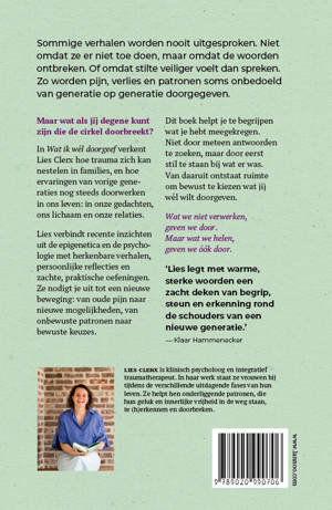 Sommige verhalen worden nooit uitgesproken. Niet omdat ze er niet toe doen, maar omdat de woorden ontbreken. Of omdat stilte veiliger voelt dan spreken. Zo worden pijn, verlies en patronen soms onbedoeld van generatie op generatie doorgegeven. Maar wat als jij degene kunt zijn die de cirkel doorbreekt? In Wat ik wél doorgeef verkent Lies Clerx hoe trauma zich kan nestelen in families, en hoe ervaringen van vorige generaties nog steeds doorwerken in ons leven: in onze gedachten, ons lichaam en onze relaties. Lies verbindt recente inzichten uit de epigenetica en de psychologie met herkenbare verhalen, persoonlijke reflecties en zachte, praktische oefeningen. Ze nodigt je uit tot een nieuwe beweging: van oude pijn naar nieuwe mogelijkheden, van onbewuste patronen naar bewuste keuzes. Dit boek helpt je te begrijpen wat je hebt meegekregen. Niet door meteen antwoorden te zoeken, maar door eerst stil te staan bij wat er was. Van daaruit ontstaat ruimte om bewust te kiezen wat jij wél wilt doorgeven. Wat we niet verwerken, geven we door. Maar wat we helen, geven we óók door.