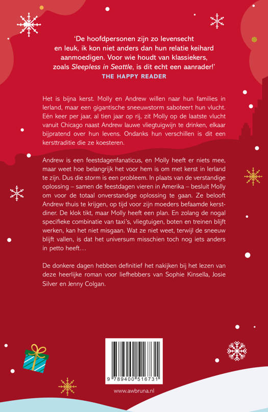 Molly heeft niks met kerst, Andrew is een feestdagenfanaticus, en Molly weet hoe belangrijk hij het vindt om daarvoor in Ierland te zijn. Dus die storm is een probleem. In plaats van de verstandige oplossing – samen de feestdagen vieren in Amerika – besluit ze om voor de totaal onverstandige oplossing te gaan. Ze belooft hem thuis te krijgen, op tijd voor zijn moeders befaamde kerstdiner. De klok tikt, maar Molly heeft een plan. En zolang de nogal specifieke combinatie van taxi’s, vliegtuigen, boten en treinen blijft werken, kan het niet misgaan. Wat ze niet weet, terwijl de sneeuw blijft vallen, is dat het universum misschien toch nog iets anders in petto heeft…