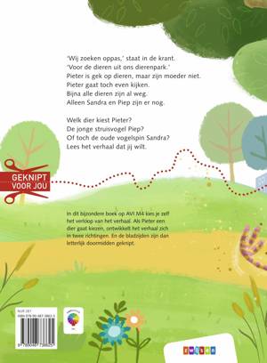 In dit bijzondere boek op AVI M4 kiest de lezer zelf de afloop van het verhaal. Hoe dat kan? Het verhaal is letterlijk doormidden geknipt. Pieter houdt erg van dieren. Hij leest in de krant: ‘Wij zoeken oppas voor de dieren uit ons dierenpark.’ Dat is echt iets voor hem! Al houdt zijn moeder niet zo van dieren, toch kan Pieter het niet laten om even te gaan kijken. Alleen een struisvogel en vogelspin zijn nog over. Welk dier kan hij het beste kiezen en voor zijn moeder verborgen houden? \Vanaf dit punt in het boek zijn de pagina’s doormidden geknipt en ontwikkelt het verhaal zich in twee richtingen. In het bovenste verhaal kiest Pieter voor de jonge, onstuimige struisvogel Piep en in het onderste verhaal voor de oude vogelspin Sandra. Of zijn keuzes nou zo verstandig zijn? Welk verhaal je ook leest, dit boek is geknipt voor jou!