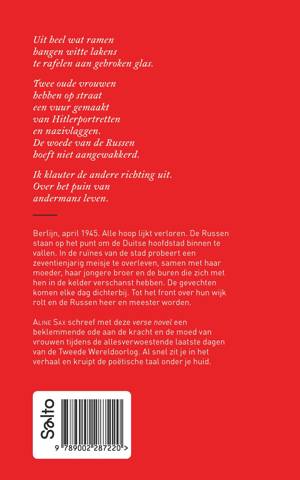 Uit heel wat ramenhangen witte lakenste rafelen aan gebroken glas. Twee oude vrouwenhebben op straateen vuur gemaaktvan Hitlerportrettenen nazivlaggen.De woede van de Russenhoeft niet aangewakkerd. Ik klauter de andere richting uit.Over het puin vanandermans leven. Berlijn, april 1945. Alle hoop lijkt verloren. De Russen staan op het punt om de Duitse hoofdstad binnen te vallen. In de ruïnes van de stad probeert een zeventienjarig meisje te overleven, samen met haar moeder, haar jongere broer en de buren die zich met hen in de kelder verschanst hebben. De gevechten komen elke dag dichterbij. Tot het front over hun wijk rolt en de Russen heer en meester worden. Aline Sax schreef met deze verse novel een beklemmende ode aan de kracht en de moed van vrouwen tijdens de allesverwoestende laatste dagen van de Tweede Wereldoorlog. Al snel zit je in het verhaal en kruipt de poëtische taal onder je huid.