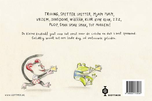 Triiing, spetter spetter, mjam mjam, vroem, dingdong, wèèèèh, klok klok klok, zzz, plop, smak smak smak, tot morgen! De kleine krokodil gaat voor het eerst naar de crèche. Dat is best spannend. Gelukkig wordt het een leuke dag, vol vertrouwde én nieuwe geluiden. Aan het eind van de eerste dag op het kinderdagverblijf heeft de kleine krokodil een heerlijke tijd gehad. Klop-klop doet dan de deur. Daar is de grote krokodil al om de kleine krokodil mee naar huis te nemen. Eva Montanari begon tijdens haar studie al prentenboeken te schrijven en te illustreren. Ze werkt vooral met krijt en potlood. Hierdoor krijgen haar beelden een uniek, ambachtelijk tintje. Haar illustraties komen tot leven in dit stevige kartonboek om voor te lezen.