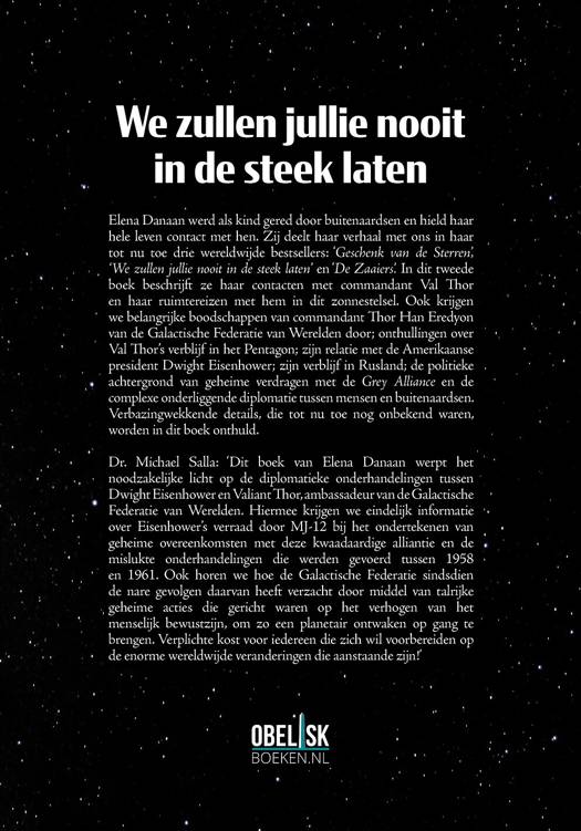 Elena Danaan werd als kind gered door buitenaardsen en hield haar hele leven contact met hen. Zij deelt haar verhaal met ons in haar tot nu toe drie wereldwijde bestsellers: ‘Geschenk van de Sterren’, ‘We zullen jullie nooit in de steek laten’ en ‘De Zaaiers’. In dit tweede boek beschrijft ze haar contacten met commandant Val Thor en haar ruimtereizen met hem in dit zonnestelsel. Ook krijgen we belangrijke boodschappen van commandant Thor Han Eredyon van de Galactische Federatie van Werelden door; onthullingen over Val Thor's verblijf in het Pentagon; zijn relatie met de Amerikaanse president Dwight Eisenhower; zijn verblijf in Rusland; de politieke achtergrond van geheime verdragen met de Grey Alliance en de complexe onderliggende diplomatie tussen mensen en buitenaardsen. Verbazingwekkende details, die tot nu toe nog onbekend waren, worden in dit boek onthuld.