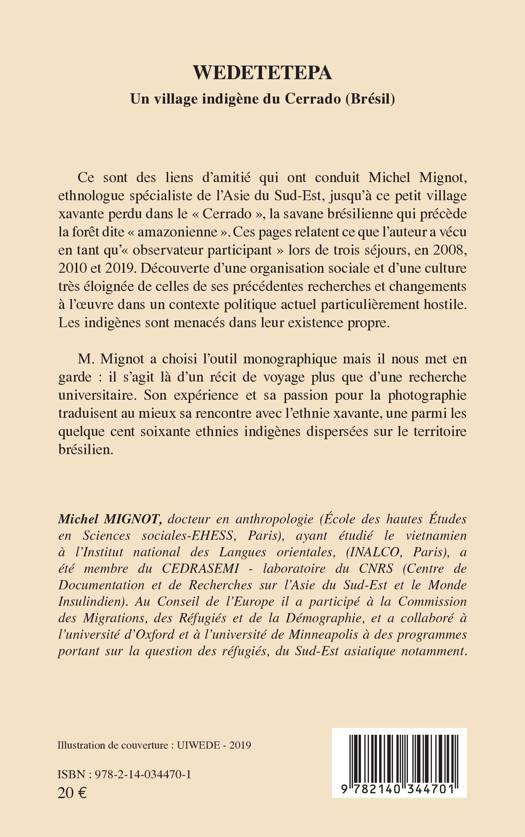 Ce sont des liens d'amitié qui ont conduit Michel Mignot, ethnologue spécialiste de l'Asie du Sud-Est, jusqu'à ce petit village xavante perdu dans le Cerrado, la savane brésilienne qui précède la forêt dite amazonienne . Ces pages relatent ce que l'auteur a vécu en tant qu'observateur participant lors de trois se jours, en 2008, 2010 et 2019. Découverte d'une organisation sociale et d'une culture très éloignée de celles de ses précédentes recherches et changements à l'oeuvre dans un contexte politique actuel particulièrement hostile. Les indigènes sont menacés dans leur existence propre. L'expérience et la passion de l'auteur pour la photographie traduisent au mieux sa rencontre avec l'ethnie xavante, une parmi les quelque cent soixante ethnies indigènes dispersées sur le territoire brésilien.
