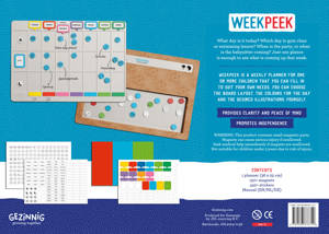 Weekpeek is een magnetische weekplanner van Gezinnig voor 1 of meer kinderen die je naar eigen behoefte kan vullen. Kies zelf de indeling van het bord, de kleuren van de dag en de gewenste illustraties. Ruime keuze uit heldere pictogrammen van activiteiten en personen om samen de weekplanning te maken. Geschikt voor kinderen vanaf 3 jaar.