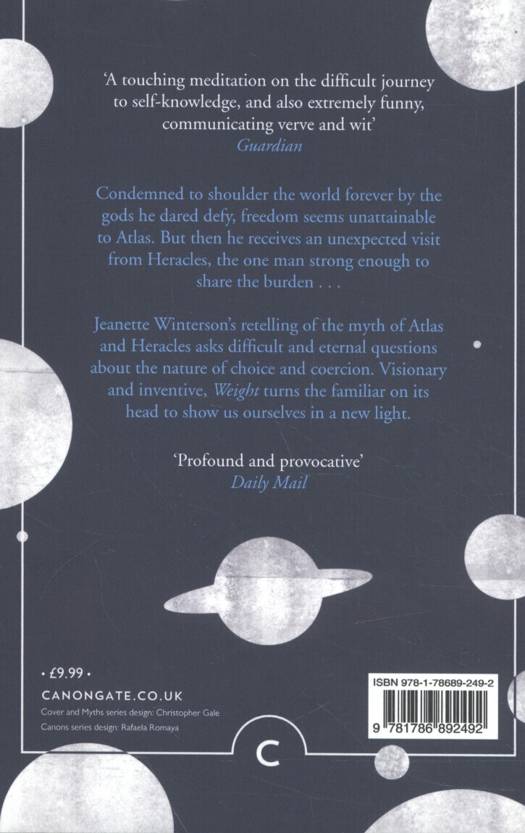 Jeanette Winterson's retelling of the myth of Atlas and Heracles asks difficult and eternal questions about the nature of choice and coercion. Visionary and inventive, Weight turns the familiar on its head to show us ourselves in a new light. The Myths series brings together some of the world's finest writers, each of whom has retold a myth in a contemporary and memorable way. Authors in the series include Karen Armstrong, Margaret Atwood, A.S. Byatt, David Grossman, Natsuo Kirino, Alexander McCall Smith, Philip Pullman, Ali Smith and Jeanette Winterson.