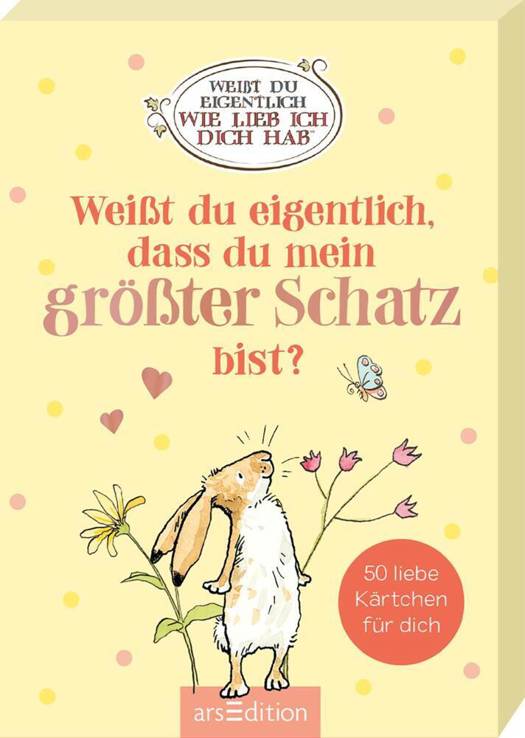 Der weltbekannte Kinderbuchklassiker "Weißt du eigentlich, wie lieb ich dich hab?" hat Millionen von Menschen verzaubert. Geschrieben von Sam McBratney und liebevoll illustriert von Anita Jeram vermittelt die Geschichte des kleinen und des großen Hasen Werte wie Zusammengehörigkeit, Liebe und Geborgenheit. Diese Kartenbox ist ein tolles Geschenk für alle Herzensmenschen. Ob für den liebsten Schatz, die beste Freundin oder Tochter und Sohn - diese Kartenbox zaubert garantiert ein Lächeln ins Gesicht und lässt das Herz vor Freude hüpfen. Auf jeder Karte ist ein schöner Spruch, ein Zitat oder eine Botschaft, wie schön es ist, dass es den anderen gibt. Kombiniert mit den zauberhaften Hasen-Illustrationen sind die Karten nicht nur ein schönes Kompliment, sondern können auch als Glücksbringer dienen. Einfach eine Karte ziehen, den Gedanken mit in den Tag nehmen und sich immer wieder daran erfreuen!