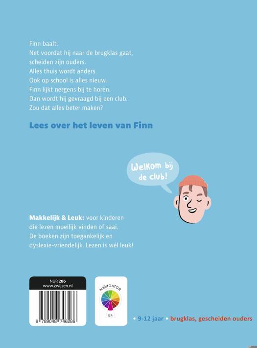 Ga je eindelijk naar de brugklas, vertellen je ouders je dat ze gaan scheiden. Nóg meer veranderingen in je leven, heftig. Lees hoe Finn hiermee omgaat. Zou de club kinderen van gescheiden ouders alles makkelijker maken? Of juist niet … Herkenbaar verhaal op AVI E4 voor kinderen van 9-12 jaar in de serie ‘Makkelijk & Leuk’, speciaal voor kinderen die lezen moeilijk vinden of saai. Zo krijgen zij weer plezier in lezen. Dyslexievriendelijk!