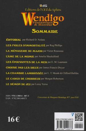 ÉDITORIAL par Richard D. Nolane LES FIOLES D'IMMORTALITÉ par Rog Phillips LA MÉNAGERIE DU MAJOR par Victor Rousseau L'ÂME DE LA MOMIE par Amelia Shackelford LES ÉPOUVANTES DE LA MER par E. M. Laumann CHOISIE PAR LES DIEUX par James Francis Dwyer LA CHAMBRE LAMBRISSÉE par L. T. Meade & Clifford Halifax LE CARGO DE L'HORREUR par Morgan Robertson LE DÉMON DU JEU par Leroy Yerxa