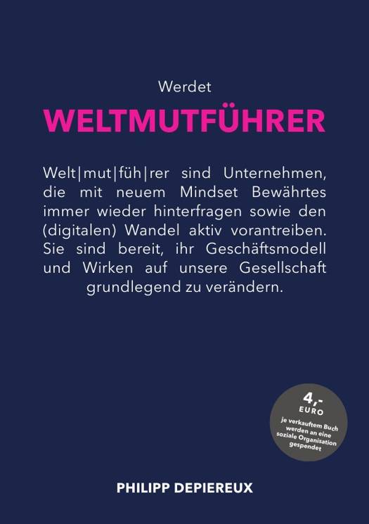 Definition der Weltmutführer-Unternehmen:Welt|mut|füh|rer sind Unternehmen, die mit neuem Mindset Bewahrtes immer wieder hinterfragen sowie den (digitalen) Wandel aktiv vorantreiben. Sie sind bereit, ihr Geschaftsmodell und Wirken auf unsere Gesellschaft grundlegend zu verandern.Wie gelingt der Mindset- und Kulturwandel im Team und Unternehmen? Wie können Organisationsstrukturen, Vertriebskanäle, Prozesse und Geschäftsmodelle neu gedacht werden? Welche Rahmenbedingungen braucht es, damit Führungskräfte und Mitarbeitende die bewahrende Grundhaltung ablegen und mit Begeisterung und Rückenwind die digitale Zukunft gestalten?Der Unternehmer, Digitalpionier und ChangeRider Philipp Depiereux zeigt anhand zahlreicher Praxisbeispiele, wie sich Organisationen in dieser komplexen und sich ständig wandelnden Welt zurechtfinden. Denn die digitale Transformation bringt nicht nur große Herausforderungen, sie bietet auch einmalige Chancen.Seit über zehn Jahren helfen der aus einer Weltmarktführer-Familie stammende etventure CEO und sein Team mutigen Unternehmen dabei, mit modernen Innovationsmethoden digitale Erfolgsgeschichten zu schreiben. Gemeinsam gestalten sie den Wandel für eine lebenswerte Zukunft, bei dem immer der Mensch im Mittelpunkt steht. In diesem Buch berichtet Depiereux optimistisch, selbstkritisch und voller Tatendrang aus seinem Unternehmeralltag. Es geht um disruptive Methoden, Erfolge, Scheitergeschichten und eine gute Portion Mut.Sein Appell an alle, die die Wirtschaft nachhaltig positiv gestalten möchten: "Schiebt das altbewährte Ingenieursdenken und den Perfektionismus beiseite und beschreitet mutig neue Wege! Werdet WELTMUTFÜHRER!"