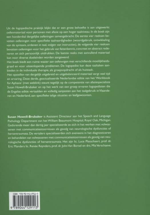 Het opstellen van dergelijk uitgebreid en uitgebalanceerd materiaal vergt veel tijd en ervaring. Deze derde, geactualiseerde Nederlandse editie van het 'Workbook for Aphasia' (met weblink) steunt tegelijk op de competentie van afasiespecialiste Susan Howell-Brubaker en op het werk van een groep ervaren logopedisten die de Engelse editie vertaalden en volledig aanpasten aan het taalgebruik in Vlaanderen en Nederland, aan specifieke talige situaties en leefgewoonten.