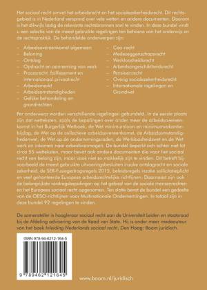 Het sociaal recht omvat het arbeidsrecht en het socialezekerheidsrecht. Dit rechtsgebied is in Nederland verspreid over vele wetten en andere documenten. Daarom is het dikwijls lastig de relevante rechtsbronnen snel te vinden. In deze bundel vindt u een selectie van de meest gebruikte regelingen ten behoeve van het onderwijs en de rechtspraktijk. De behandelde onderwerpen zijn: – Arbeidsovereenkomst algemeen – Beloning – Ontslag – Opdracht en aanneming van werk – Procesrecht, faillissement en internationaal privaatrecht – Arbeidsmarkt – Arbeidsomstandigheden – Gelijke behandeling en grondrechten – Cao-recht – Medezeggenschapsrecht – Werkloosheidsrecht – Arbeidsongeschiktheidsrecht – Pensioenrecht – Overig socialezekerheidsrecht – Internationale regelingen en Grondwet Per onderwerp worden verschillende regelingen gebundeld. In de eerste plaats zijn dat wetteksten, zoals de bepalingen over onder meer de arbeidsovereenkomst in het Burgerlijk Wetboek, de Wet minimumloon en minimumvakantiebijslag, de Wet op de collectieve arbeidsovereenkomst, de Arbeidsomstandighedenwet, de Wet op de ondernemingsraden, de Werkloosheidswet en de Wet werk en inkomen naar arbeidsvermogen. De bundel beperkt zich echter niet tot circa 55 wetteksten, maar bevat ook andere documenten die voor het sociaal recht van belang zijn, maar vaak niet zo makkelijk zijn te vinden. Dit betreft bijvoorbeeld de meest gebruikte uitvoeringsbesluiten inzake ontslagrecht en sociale zekerheid, de SER-Fusiegedragsregels 2015, beleidsregels inzake sollicitatieplicht en veel gehanteerde Europese arbeidsrechtelijke richtlijnen. Daarnaast zijn ook de belangrijkste verdragsbepalingen op het gebied van de sociale mensenrechten en het Europees sociaal recht opgenomen. Ten slotte bevat de bundel een gedeelte van de OESO-richtlijnen voor Multinationale Ondernemingen. In totaal zijn in deze bundel 92 regelingen te vinden.