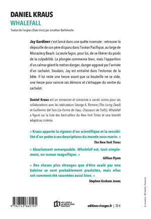 Jay Gardiner s'est lancé dans une quête insensée : retrouver la dépouille de son père disparu dans l'océan Pacifique, au large de Monastery Beach. La seule façon, pour lui, de se libérer du poids de la culpabilité. La plongée commence bien, mais l'apparition d'un calmar géant le met en danger, danger aggravé par l'arrivée d'un cachalot. Soudain, Jay est entraîné dans l'estomac de la bête. Il lui reste une heure avant que ses bouteilles ne se vident, une heure pour vaincre ses démons et s'échapper du ventre du cachalot. « Kraus apporte la rigueur d'un scientifique et la sensibilité d'un poète à ses descriptions du monde sous-marin. » The New York Times « Absolument remarquable. Whalefall est, tout simplement, un roman magnifique. » Gillian Flynn « Des choses plus étranges que d'être avalé par une baleine se sont probablement produites, mais elles ont rarement été racontées aussi bien. » Stephen Graham Jones