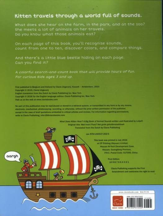 Kitten travels through a world full of sounds. What does she hear on the farm, in the park, and at the zoo? She meets a lot of animals on her travels. Do you know what those animals eat? On each page of this book, you'll recognize sounds, count from one to ten, discover colors, and compare things. And there's a little blue beetle hiding on each page. Can you find it?