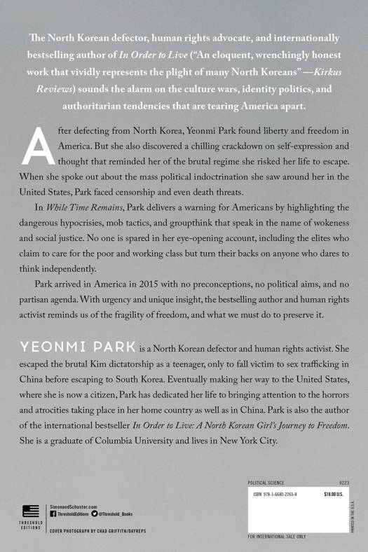 While Time Remains, Park sounds the alarm for Americans by highlighting the dangerous hypocrisies, mob tactics, and authoritarian tendencies that speak in the name of wokeness and social justice. No one is spared in her eye-opening account, including the elites who claim to care for the poor and working classes but turn their backs on anyone who dares to think independently.