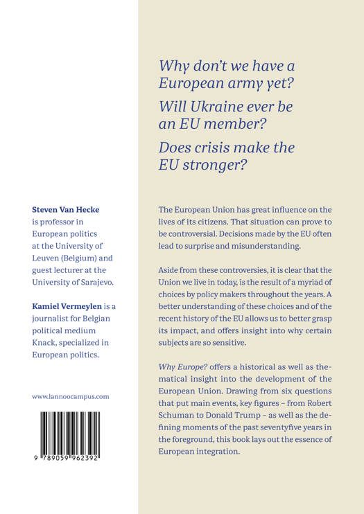 Why don't we have a European army yet? Will Ukraine ever be an EU member? Does crisis make the EU stronger? The European Union has great influence on the lives of its citizens. That situation can prove to be controversial. Decisions made by the EU often lead to surprise and misunderstanding. Aside from these controversies, it is clear that the Union we live in today, is the result of a myriad of choices by policy makers throughout the years. A better understanding of these choices and of the recent history of the EU allows us to better grasp its impact, and offers insight into why certain subjects are so sensitive. Why Europe? offers a historical as well as thematical insight into the development of the European Union. Drawing from six questions that put main events, key figures - from Robert Schuman to Donald Trump - as well as the defining moments of the past seventyfive years in the foreground, this book lays out the essence of European integration.