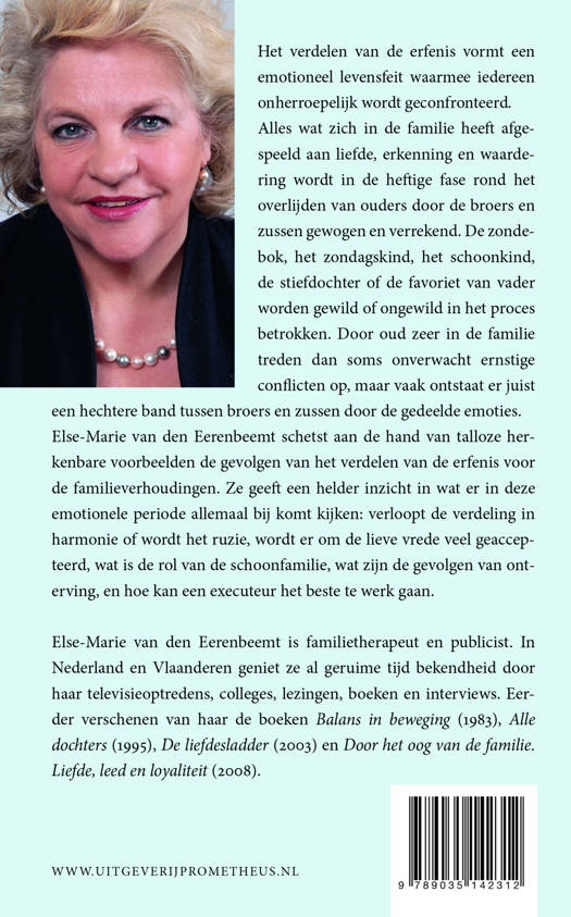 Verlies, rouw en het verdelen van de erfenis vormen een emotioneel levensfeit waarmee iedereen onherroepelijk wordt geconfronteerd. Alles wat zich in de familie heeft afgespeeld aan liefde, erkenning en waardering wordt in de heftige fase rond het overlijden van ouders door de broers en zussen gewogen en verrekend. De zondebok, het zondagskind, het schoonkind, de stiefdochter of de favoriet van vader worden gewild of ongewild in het proces betrokken. Door oud zeer in de familie treden dan soms onverwacht ernstige conflicten op, maar vaak ontstaat er juist een hechtere band tussen broers en zussen door de gedeelde emoties. Else-Marie van den Eerenbeemt schetst aan de hand van talloze herkenbare voorbeelden de gevolgen van het verdelen van de erfenis voor de familieverhoudingen. Ze geeft een helder inzicht in wat er in deze emotionele periode allemaal bij komt kijken: verloopt de verdeling in harmonie of wordt het ruzie, wordt er om de lieve vrede veel geaccepteerd, wat is de rol van de schoonfamilie, wat zijn de gevolgen van onterving, en hoe kan een executeur het beste te werk gaan.