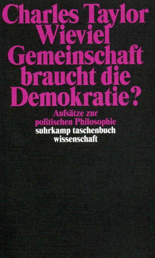 In der philosophischen Auseinandersetzung zwischen Liberalismus und Kommunitarismus gehört Charles Taylor eher zur Seite der Kommunitaristen. Geht der Liberalismus von einem Individuum aus, das unabhängig von Wertüberzeugungen und frei von sozialen Bindungen ist, betont Taylor die Rolle des Gemeinwesens und die Einbindung des Individuums in die Werte seiner Kultur. Mit der Erfahrung eigener politischer Aktivität diskutiert Taylor in seinen Aufsätzen unter dem Titel Wieviel Gemeinschaft braucht die Demokratie? Themen wie Nationalismus, Ausgrenzung, Solidarität und analysiert den Individualismus der Moderne.
