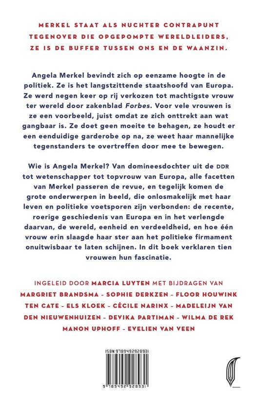 Angela Merkel staat op eenzame hoogte in de politiek. Ze is het langstzittende staatshoofd van Europa. Ze werd negen keer op rij verkozen tot machtigste vrouw ter wereld door zakenblad Forbes. Voor vele vrouwen is ze een groot voorbeeld, juist omdat ze zich onttrekt aan wat gangbaar is. Ze doet geen moeite te behagen, ze houdt er een eenduidige garderobe op na, ze weet haar mannelijke tegenstanders te overtreffen door mee te bewegen. Wie is Angela Merkel? Van domineesdochter uit de DDR tot wetenschapper tot topvrouw van Europa, alle facetten van Merkel passeren de revue, en tegelijk komen de grote onderwerpen in beeld, die onlosmakelijk met haar leven en politieke voetsporen zijn verbonden: de recente, roerige geschiedenis van Europa en in het verlengde daarvan, de wereld, eenheid en verdeeldheid, en hoe één vrouw erin slaagde haar ster aan het politieke firmament onuitwisbaar te laten schijnen. In dit boek verklaren tien vrouwen hun fascinatie.