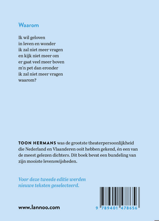 TOON HERMANS was de grootste theaterpersoonlijkheid die Nederland en Vlaanderen ooit hebben gekend, én een van de meest gelezen dichters. Dit boek bevat een bundeling van zijn mooiste levenswijsheden.