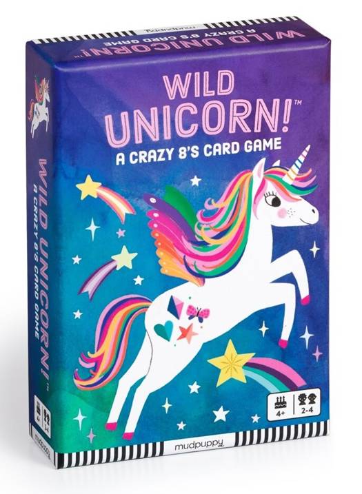The Wild Unicorn! Card Game by Mudpuppy is a magical take on Crazy 8's. Cards feature a rainbow spectrum of unicorns with the classic suits swapped for star and butterfly icons, making this version of cards an easier game to play than classic 52 card decks. Players match cards by color or suit, or can play the coveted wild card, which is of course the full-color, rainbow-striped unicorn. - Box: 3.25 x 4.75 x 1", 8 x 12 x 2.5 cm - Ages 4+ - Players: 2-4 - Instructions included