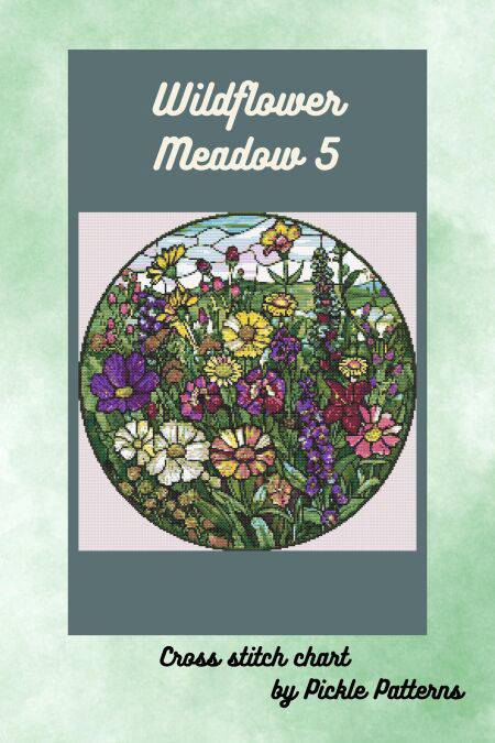 The colour palette is incredibly diverse and rich, with no single colour dominating. The artist has skilfully used varying shades to create a sense of depth and realism. The style is realistic, yet rendered in the stylized manner typical of cross-stitch, giving it a vintage-inspired quality. The mood is peaceful and joyful, evoking feelings of calmness and appreciation for the beauty of nature. The arrangement of flowers feels somewhat chaotic but in a visually pleasing, natural way, much like a real wildflower meadow.