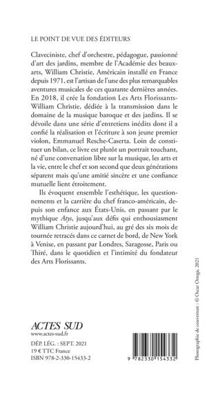 Claveciniste, chef d'orchestre, pédagogue, passionné d'art des jardins, membre de l'Académie des beaux-arts, William Christie, Américain installé en France depuis 1971, est l'artisan de l'une des plus remarquables aventures musicales de ces quarante dernières années. En 2018, il crée la fondation Les Arts Florissants-William Christie, dédiée à la transmission dans le domaine de la musique baroque et des jardins. Il se dévoile dans une série d'entretiens inédits dont il a confié la réalisation et l'écriture à son jeune premier violon, Emmanuel Resche-Caserta. Loin de constituer un bilan, ce livre est plutôt un portrait touchant, né d'une conversation libre sur la musique, les arts et la vie, entre le chef et son second que deux générations séparent mais qu'une amitié sincère et une confiance mutuelle lient étroitement. Ils évoquent ensemble l'esthétique, les questionnements et la carrière du chef franco-américain, depuis son enfance aux États-Unis, en passant par le mythique Atys, jusqu'aux défis qui enthousiasment William Christie aujourd'hui, au gré des six mois de tournée retracés dans ce carnet de bord, de New York à Venise, en passant par Londres, Saragosse, Paris ou Thiré, dans le quotidien et l'intimité du fondateur des Arts Florissants.