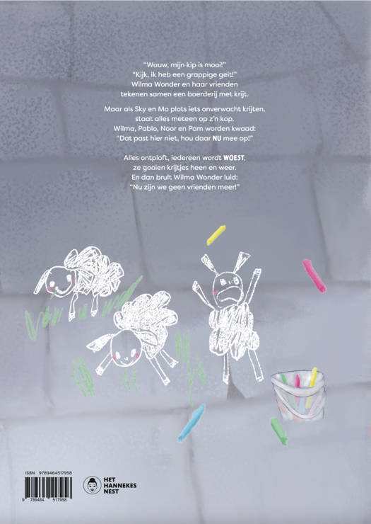 “Wauw, mijn kip is goed gelukt!” “Kijk, ik heb een grappige geit!” Wilma Wonder en haar vrienden tekenen samen een boerderij met krijt.