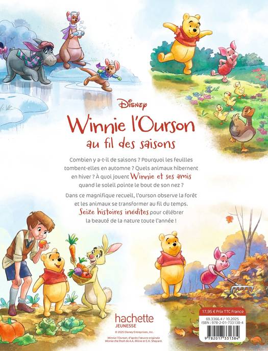 Un recueil pour célébrer la beauté de la nature toute l’année ! Combien y a-t-il de saisons ? Pourquoi les feuilles tombent-elles en automne ? Quels animaux hibernent en hiver ? À quoi jouent Winnie et ses amis quand le soleil pointe le bout de son nez ? Dans ce magnifique recueil, l’ourson observe la forêt et les animaux se transformer au fil du temps. Seize histoires inédites pour admirer la nature, de janvier à décembre ! Dès 3 ans.