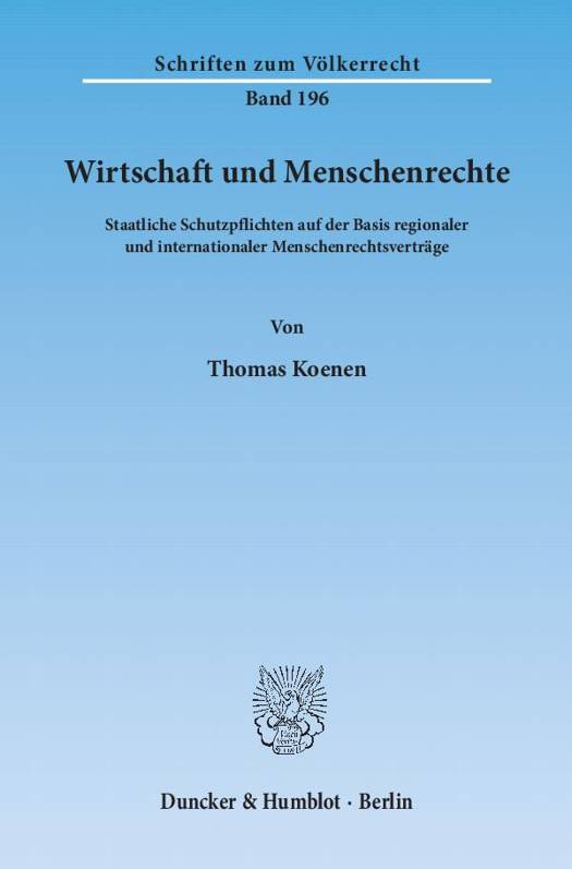 Thomas Koenen untersucht Art und Ausmaß staatlicher Pflichten zum Schutz von natürlichen Personen vor menschenrechtsbeeinträchtigenden Aktivitäten privatwirtschaftlicher Unternehmen. Bezugnehmend auf die Arbeit des UN-Sonderbeauftragten für Wirtschaft und Menschenrechte analysiert er nebst Vertragstexten einschlägige Urteile und Entscheidungen zu den regionalen und internationalen Menschenrechtsverträgen. Neben inländischen Schutzpflichten überprüft der Autor Schutzpflichten mit Blick auf extraterritoriale Aktivitäten transnationaler Unternehmen. Die Analyse ergibt ein differenziertes Bild über den Entwicklungsgrad staatlicher Schutzpflichten. Dynamische Interpretationen regionaler wie internationaler Menschenrechtsverträge in den vergangenen Jahren begründen demnach eine bemerkenswerte Entwicklung von reinen Abwehrrechten hin zu umfassenderen staatlichen Schutzpflichten, die zunehmend auch die Aktivitäten privater Unternehmen umfassen.