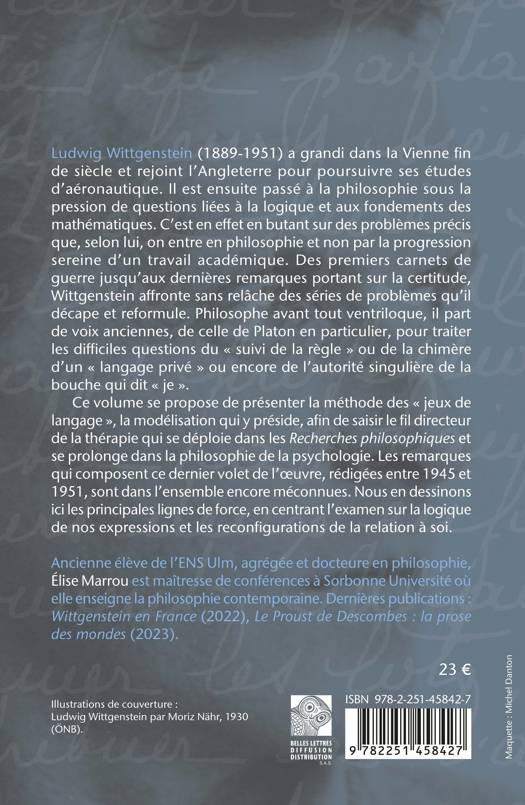 Ce volume se propose de présenter la méthode des « jeux de langage », la modélisation qui y préside, afin de saisir le fil directeur de la thérapie qui se déploie dans les Recherches philosophiques et se prolonge dans la philosophie de la psychologie. Les remarques qui composent ce dernier volet de l’oeuvre, rédigées entre 1945 et 1951, sont dans l’ensemble encore méconnues. Nous en dessinons ici les principales lignes de force, en centrant l’examen sur la logique de nos expressions et les reconfigurations de la relation à soi.