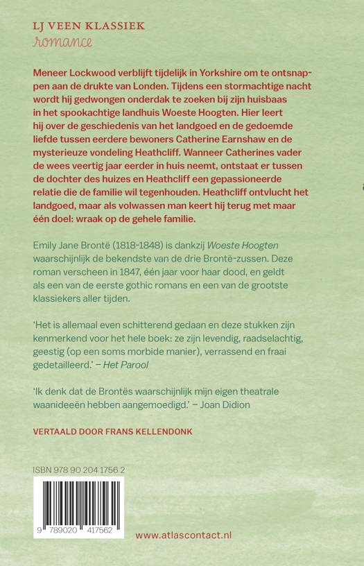 Tijdens een stormachtige nacht wordt Lockwood gedwongen onderdak te zoeken in het spookachtige landhuis van zijn verhuurder: Woeste Hoogten. Daar hoort hij het verhaal van de vurige, gedoemde liefde tussen Catherine Earnshaw en de donkere en mysterieuze Heathcliff.Emily Jane Brontë (1818-1848) is dankzij Woeste Hoogten waarschijnlijk de bekendste van de drie Brontë-zussen, hoewel niet degene die het meest publiceerde. Haar enige roman verscheen in 1847, één jaar voor haar dood, en geldt als een van de eerste gothic romans en een van de grootste klassiekers aller tijden.
