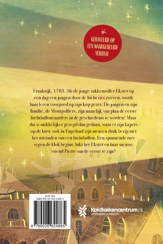 Een verhaal met inbraak, spionage, bijzondere huisdieren en nieuwe uitvindingen. Een ontmoeting met een in de lucht bungelende jongen verandert het leven van de jonge zakkenroller Ekster voorgoed. De jongen en zijn familie, de Montgolfiers, zijn erop gebrand de eerste luchtballonvaarders in de geschiedenis te worden! Maar dat blijkt makkelijker gezegd dan gedaan, want er zijn kapers op de kust: ook in Engeland zijn mensen druk bezig met het uitvinden van een luchtballon. Lukt het Pierre en Ekster om de eerste te zijn? Een fantastisch avontuur vol spionnen, ongehoorzame huisdieren en een ontmoeting met de koning van Frankrijk en zijn vrouw Marie-Antoinette.