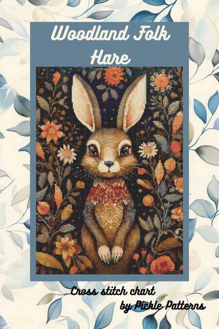 This cross stitch chart is a whimsical design of a hare with a cute costume in a folk art woodland setting. The colour palette is dark and dramatic in sharp contrast to the cute animal figure.