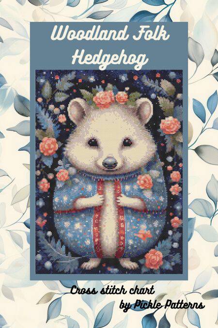 This cross stitch chart is a whimsical design of a hedgehog with a cute costume in a folk art woodland setting. The colour palette is dark and dramatic in sharp contrast to the cute animal figure.
