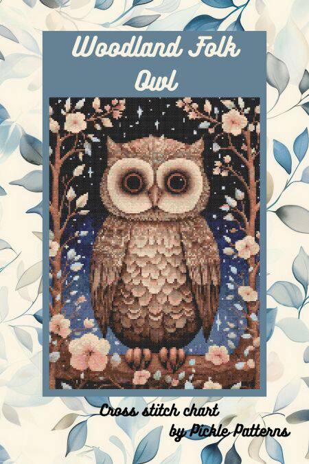This cross stitch chart is a whimsical design of an owl a folk art woodland setting. The colour palette is dark and dramatic in sharp contrast to the cute animal figure.
