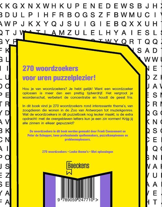 Hou je van woordzoekers? Je hebt gelijk! Want een woordzoeker oplossen is meer dan een prettig tijdverdrijf. Het vergroot je woordenschat, verbetert de concentratie en houdt de geest fris. In dit boek vind je 270 woordzoekers rond interessante thema's. Wat de woordzoekers in dit puzzelboek nog leuker maakt, is de extra opdracht: met de overgebleven letters kun je een zin vormen! Krijg jij alle zinnen in elkaar gepuzzeld? De woordzoekers in dit boek werden gemaakt door Frank Coussement en Peter de Schepper, twee professionele spellenmakers, puzzelkampioenen en probleemoplossers.