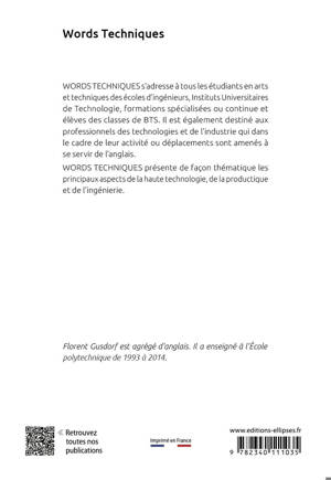 WORDS TECHNIQUES s'adresse à tous les étudiants en arts et techniques des écoles d'ingénieurs, Instituts Universitaires de Tech-nologie, formations spécialisées ou continue et élèves des classes de BTS. Il est également destiné aux professionnels des technologies et de l'industrie qui dans le cadre de leur activité ou déplacements sont amenés à se servir de l'anglais.