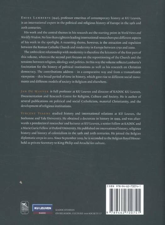Emiel Lamberts, professor emeritus of contemporary history at KU Leuven, is an international expert in the political and religious history of Europe in the nineteenth and twentieth centuries. His work and the central themes in his research are the focus of World Views and Worldly Wisdom.Contributors: Winfried Becker (Universität Passau), Bruno Béthouart (Université du Littoral Côte d'Opale), Hans Blom (Universiteit van Amsterdam), Alfredo Canavero (Università degli Studi di Milano), Philippe Chenaux (Pontificia Università Lateranense, Roma), Andrea Ciampani (LUMSA, Roma), Jo Deferme (KU Leuven), Jan De Maeyer (KADOC KU Leuven), Henk De Smaele (Universiteit Antwerpen), Carine Dujardin (KADOC KU Leuven), Jean-Dominique Durand (Université Lyon 3), Michael Gehler (Jean Monnet Chair, Universität Hildesheim - Institut für Neuzeit- und Zeitgeschichtsforschung, Wien), Susana Monreal (Universidad Católica del Uruguay), Patrick Pasture (KU Leuven), Patrick M.W. Taveirne (The Chinese University of Hong Kong), Peter Van Kemseke (Europese Commissie, KU Leuven), Vincent Viaene (Attaché bij het Huis van Koning Filip), Els Witte (Vrije Universiteit Brussel)
