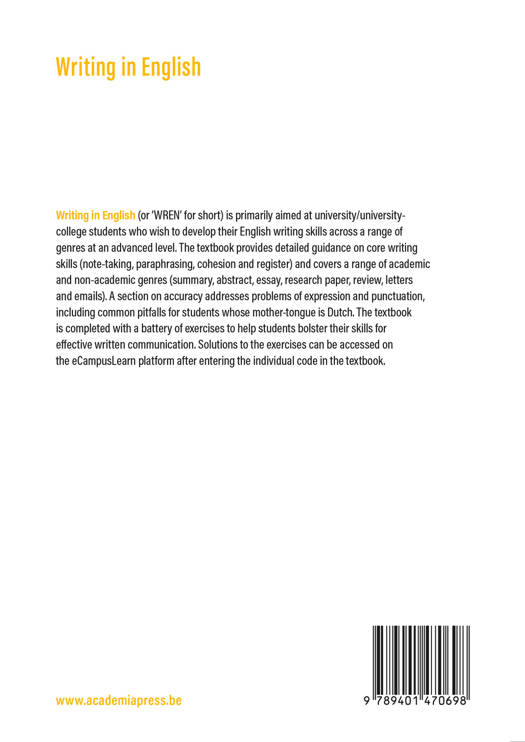 Dit handboek, dat volledig in het Engels is geschreven, is een leidraad voor studenten die hun Engelse schrijfvaardigheid naar een gevorderd niveau willen tillen. In het eerste deel komen fundamentele schrijfvaardigheden aan bod, zoals parafraseren of het nemen van notities. Het tweede deel bevat een waaier aan oefeningen, met sleutel, die studenten helpen om de vaardigheden te ontwikkelen die nodig zijn om efficiënt en doeltreffend te communiceren in geschreven Engels.