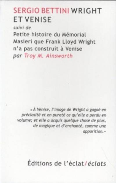 En 1952, Paolo Masieri commande à l'architecte américain Frank Lloyd Wright la construction d'un palazzino sur le Grand Canal à Venise, à la mémoire de son fils disparu. Les plans sont dessinés, mais le tollé que suscite le projet résolument moderne de Wright empêchera finalement sa réalisation. Sergio Bettini prendra fait et cause pour le « Mémorial Masieri » au nom, justement, de la richesse architecturale de la ville. Il ne fut pas entendu. Mais son plaidoyer pour « Wright à Venise » est un vibrant appel au génie vénitien ancestral qui, en refusant Wright, signera son arrêt de mort et sa progressive muséification.
