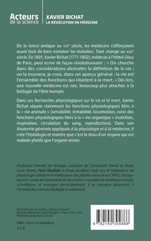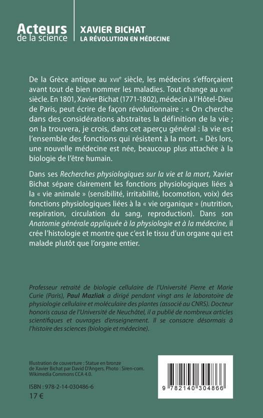 De la Grèce antique au xviie siècle, les médecins s'efforçaient avant tout de bien nommer les maladies. Tout change au xviiie siècle. En 1801, Xavier Bichat (1771-1802), médecin à l'Hôtel-Dieu de Paris, peut écrire de façon révolutionnaire: On cherche dans des considérations abstraites la définition de la vie; on la trouvera, je crois, dans cet aperçu général: la vie est l'ensemble des fonctions qui résistent à la mort. Dès lors, une nouvelle médecine est née, beaucoup plus attachée à la biologie de l'être humain. Dans ses Recherches physiologiques sur la vie et la mort, Xavier Bichat sépare clairement les fonctions physiologiques liées à la vie animale (sensibilité, irritabilité, locomotion, voix) des fonctions physiologiques liées à la vie organique (nutrition, respiration, circulation du sang, reproduction). Dans son Anatomie générale appliquée à la physiologie et à la médecine, il crée l'histologie et montre que c'est le tissu d'un organe qui est malade plutôt que l'organe entier.