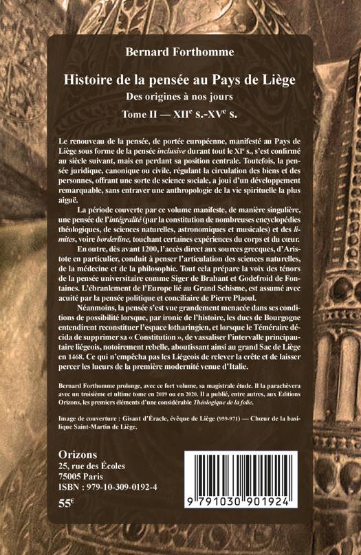 Le renouveau de la pensée, de portée européenne, manifesté au Pays de Liège sous forme de la pensée inclusive durant tout le XIe s., s'est confirmé au siècle suivant, mais en perdant sa position centrale. Au douzième siècle, la volonté d'intégration de la tradition littéraire, philosophique et religieuse antique à la connaissance prophétique et intellectuelle chrétienne, très active aux siècles antérieurs dans les écoles liégeoises, semble se confirmer. La période couverte par ce volume manifeste, de manière singulière, une pensée de l'intégralité (par la constitution de nombreuses encyclopédies théologiques, de sciences naturelles, astronomiques et musicales) et des limites touchant certaines expériences du corps et du coeur.