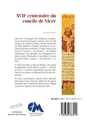 Juin 325 ! Convoqués par l'empereur Constantin le Grand récemment converti, près de 300 évêques se rendent à Nicée, cité du nord-ouest de l'Asie Mineure (Turquie actuelle) et se réunissent plusieurs semaines : il s'agit, dans ce qui sera le Ier concile « oecuménique » des Églises chrétiennes, de répondre aux dénégations du prêtre Arius d'Alexandrie et de définir la place de Jésus-Christ, comme « consubstantiel » au Père, terme qui ne se trouve pas dans l'Écriture, mais est emprunté à la philosophie grecque. La décision largement majoritaire des évêques, dont Constantin fit une loi de l'Empire romain, ne fut pas acceptée facilement et bien vite des remises en question s'exprimèrent, qui agitèrent l'Église et l'Empire jusqu'en 360 au moins. L'arianisme subsista encore longtemps, notamment chez les peuples barbares installés dans l'Empire à partir de la fin du IVe siècle. À Nicée, fut fixée la date de Pâques, 20 canons disciplinaires furent édictés, mais le « Symbole de Nicée », commun à quasiment tous les chrétiens de nos jours, en demeure l'acte le plus important. En trois contributions, Benoît GAIN, Bernard MEUNIER et Marc MILHAU s'efforcent de retenir l'essentiel d'un événement décisif pour l'Église et pour ses rapports avec le pouvoir civil.