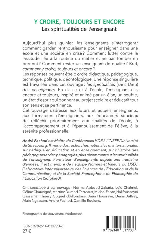 Aujourd'hui plus qu'hier, les enseignants s'interrogent: comment garder l'enthousiasme pour enseigner dans une école et une société en crise ? Comment lutter contre la lassitude liée à la routine du métier et ne pas tomber en burnout ? Comment rester un enseignant de qualité ? Bref, comment y croire, toujours et encore ? Les réponses peuvent être d'ordre didactique, pédagogique, technique, politique, déontologique. Une réponse singulière est travaillée dans cet ouvrage: les spiritualités (sans Dieu) des enseignants. En classe et à l'école, l'enseignant est, encore et toujours, inspiré et animé par un élan, un souffle, un état d'esprit qui donnent au projet scolaire et éducatif tout son sens et sa pertinence. Cet ouvrage s'adresse aux futurs et actuels enseignants, aux formateurs d'enseignants, aux éducateurs soucieux de réfléchir prioritairement aux finalités de l'école, à l'accompagnement et à l'épanouissement de l'élève, à la sérénité professionnelle.